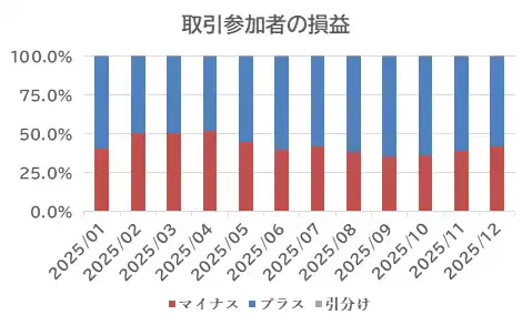 12月のFX取引において実現益を出した投資家の割合は58.1%と、11月の61.2%から3.1%ポイント減少した。実現益を出した口座は5カ月ぶりに6割を下回った。もっとも、2025年を通すと、5月以降実現益を積み上げる口座数が、実現損を計上する口座数を上回っている。 |