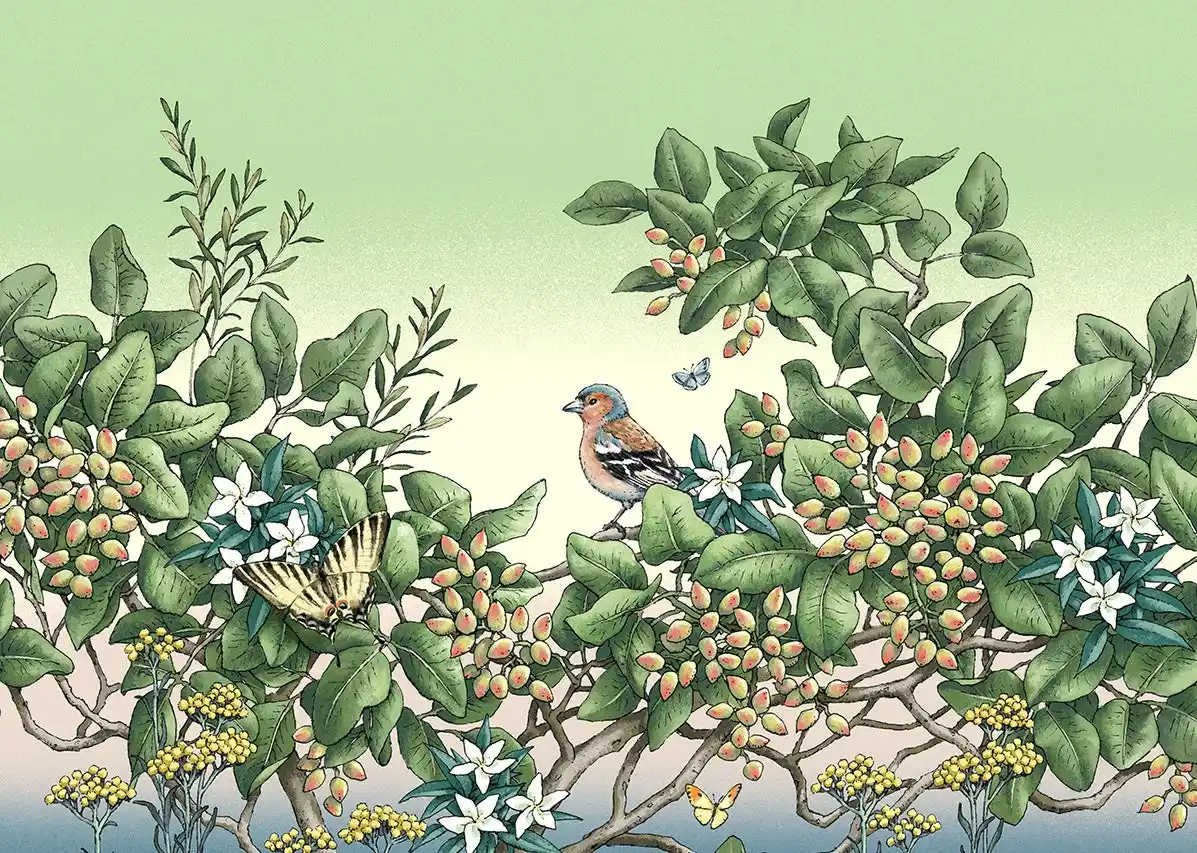 新商品パッケージは、イラストレーターの河合真維氏に依頼。 シチリア、エトナ山の麓に生育するピスタチオの木をメインのモチーフとし、シチリア由 来の動植物を配置した華やかなデザインです。 |