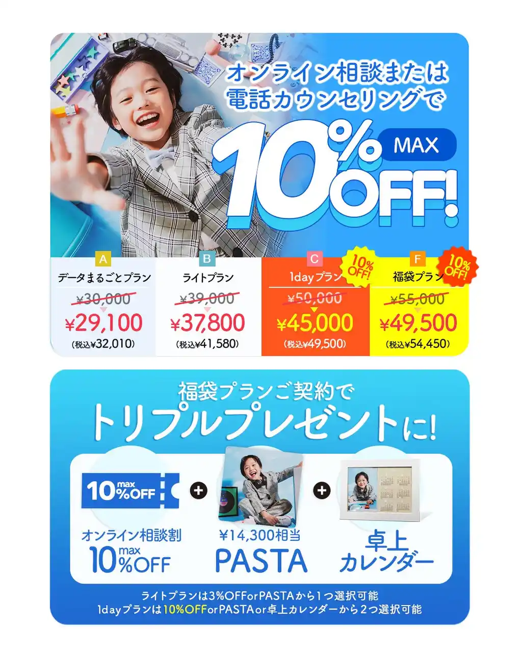 オンライン相談&電話カウンセリング割引で今月限定全プラン最大10%OFF! 福袋プランご契約で10%OFF+パスタ+卓上カレンダーの豪華トリプルプレゼント ※1dayプランは10%OFF or PASTA or 卓上カレンダーから2つ選択オッケー! ※ライトプランは3%OFF or PASTA選択オッケー! ※データまるごとプランは3%OFFのみ |
