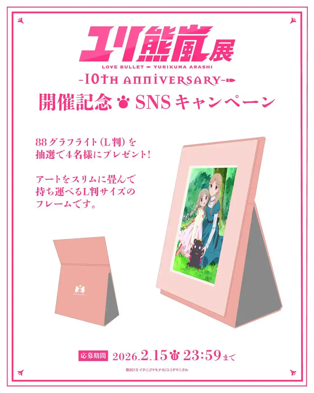 | 10周年の描き下ろしイラストや、アニメ全12話より厳選した名シーンを額装展示。また、原画やキャラクター設定資料なども展示いたします。ユリ熊嵐の世界観を再現したフォトスポット、キャラクターの等身大パネルもご用意いたします。 | |||