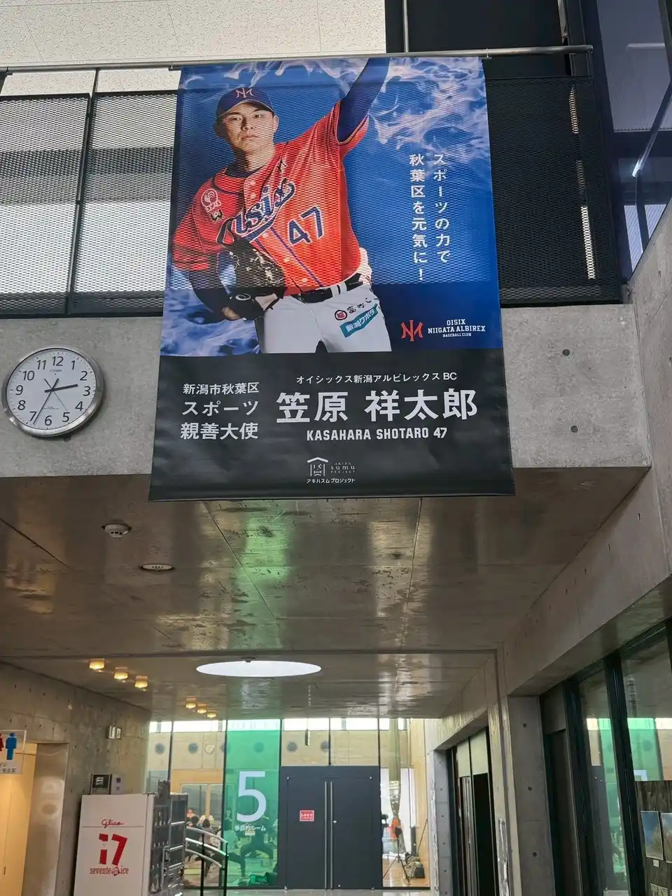 また、本就任を機に、秋葉区総合体育館(新潟県新潟市秋葉区程島2009)にて、笠原選手の2mサイズの特大バナーの掲示がスタートしました。 |