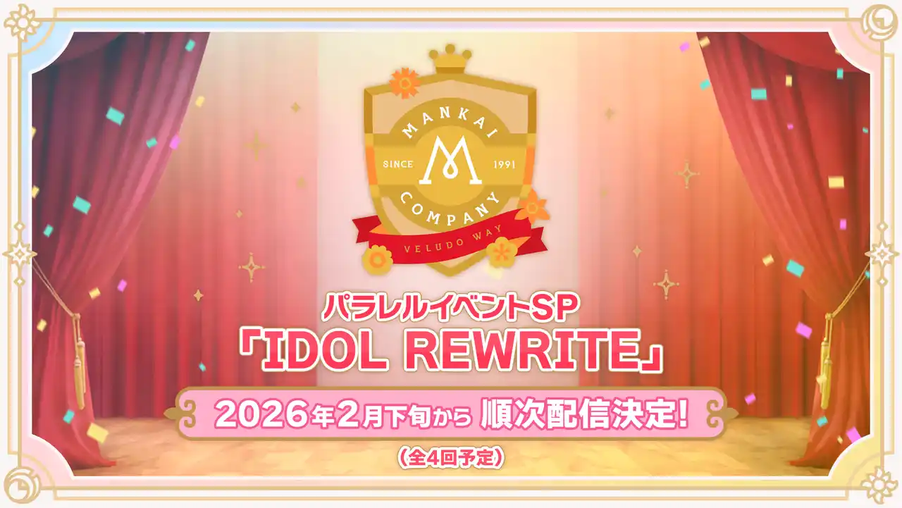 パラレルイベントSP『IDOL REWRITE(アイドル リライト)』の配信が決定しました。劇団員たちがアイドルに扮して活躍するパラレルイベントとなっています。イベントは全4回を予定しており、第1回は2月下旬より配信予定です。 |
