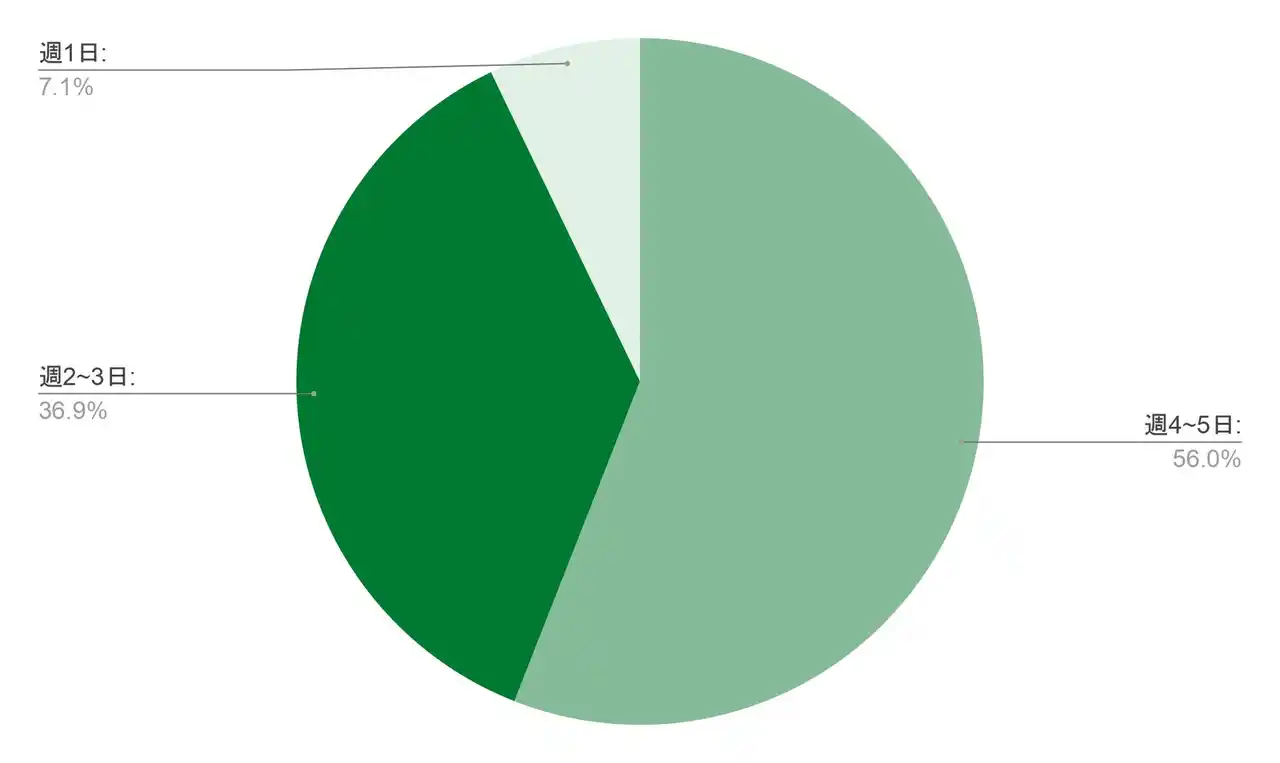 Figma案件の稼働日数は、週4~5日勤務が56.0%と過半数を占めています。一方で週2~3日勤務も36.9%と一定の割合があり、HTML案件(59.2%)やCSS案件(58.5%)と比べるとフルタイム勤務の比率がやや低めです。これはFigmaがデザインツールであり、プロジェクトの初期段階や設計フェーズで集中的に稼働する案件が存在するため、柔軟な働き方が可能なケースも多いことを反映しています。 |