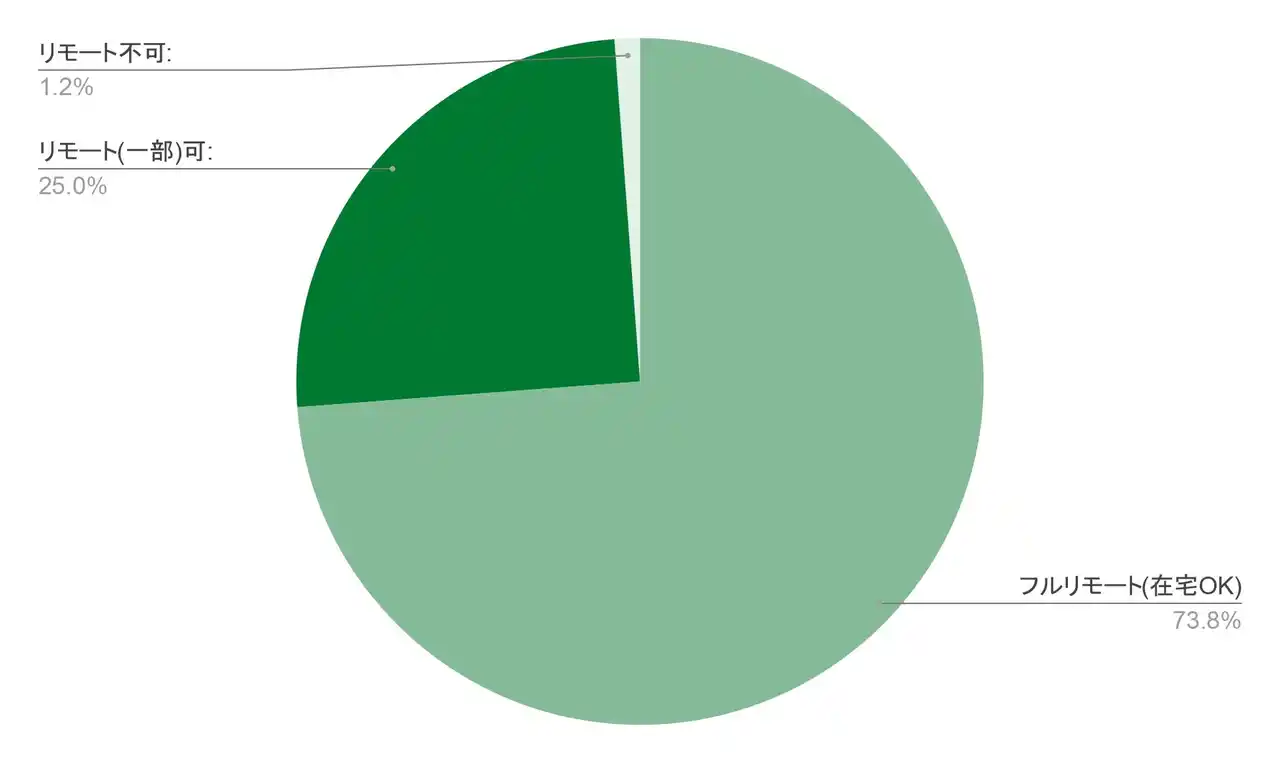 Figma案件は、フルリモート可能な案件が73.8%と非常に高い割合を占めています。HTML案件(57.4%)、CSS案件(58.1%)、WordPress案件(61.9%)と比較しても10ポイント以上高く、リモート不可の案件はわずか1.2%にとどまっています。これはFigmaがクラウドベースのデザインツールで、インターネット環境さえあればどこでも作業できる特性を持つことに起因しています。デザイン業務は成果物の共有や確認もオンラインで完結しやすいため、リモートワークとの親和性が極めて高いといえます。 |