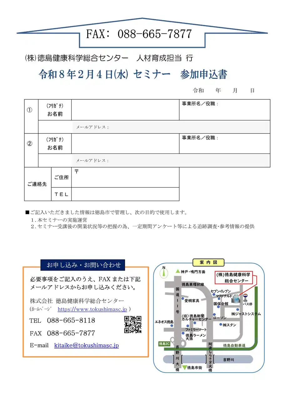 | 事前に申込みが必要です。参加申込書に必要事項を記入し、メール(E-mail:kitaike@tokushimasc.jp)または、 FAX(088-665-7877)で徳島健康科学総合センターへお申し込みください。 | |||||||||