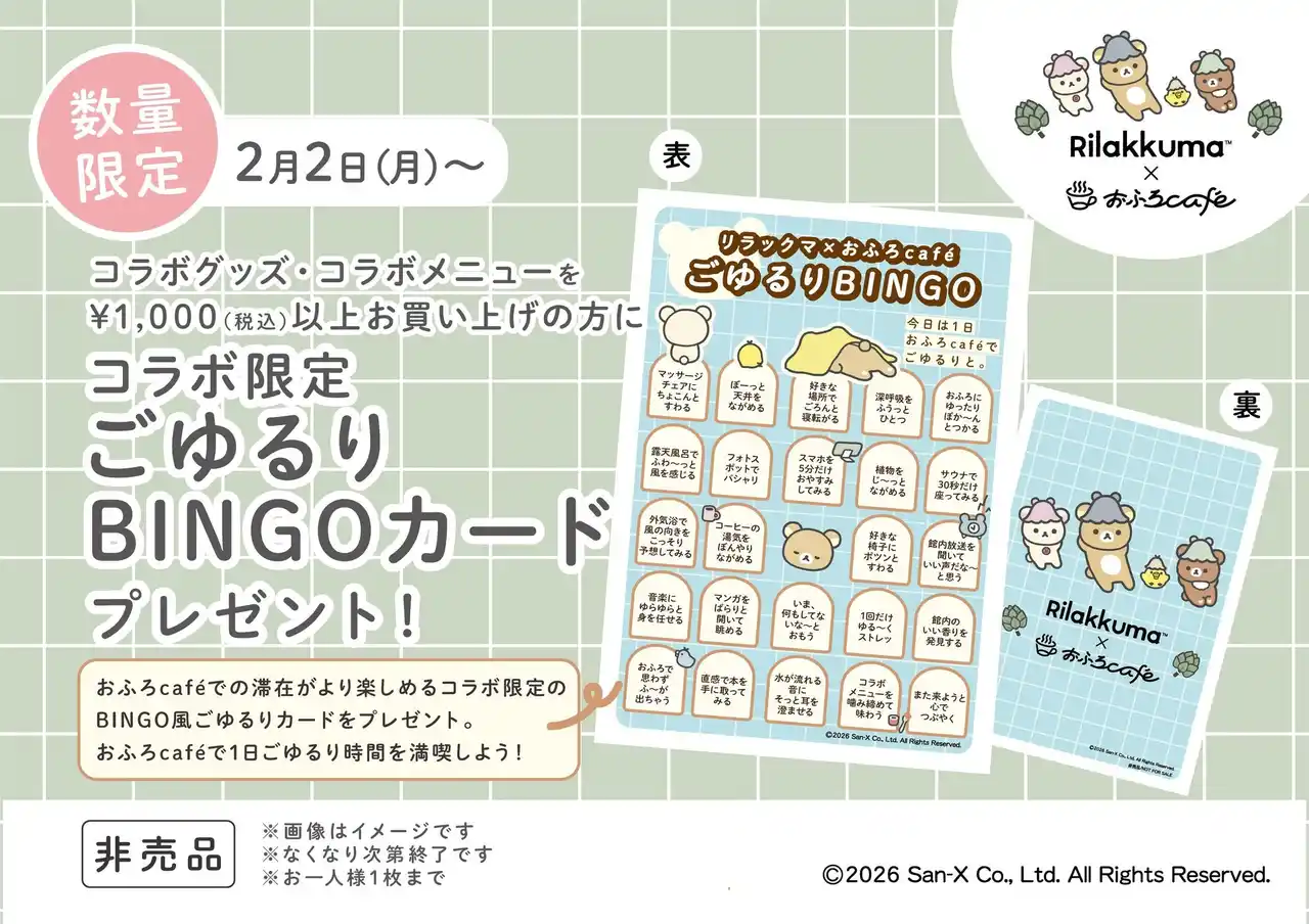 2月2日(月)より、コラボメニュー・コラボグッズを1,000円(税込)以上ご購入いただいた方に、おふろcafe 館内で楽しめる「ごゆるりBINGOカード」をプレゼントします。BINGOカードには、おふろcafe で日常から離れてごゆるりしながら1日を満喫できるミッションが記載されています。 |