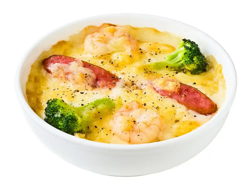 濃厚なラクレットチーズとエビ、ソーセージ、ブロッコリーをトッピング!まるでチーズフォンデュのようなドリアです。 |