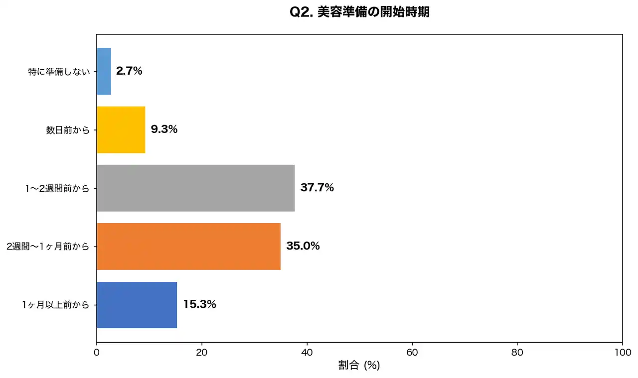 | 設問:イベント前の美容準備は、通常どのくらい前から始めますか? | ||||||||||||||||||||||||||||