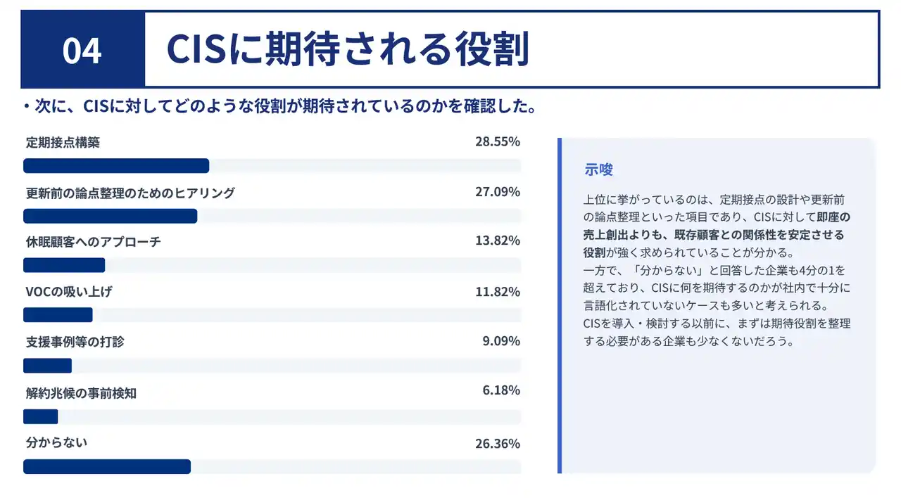 CISに期待される役割として上位に挙がったのは、「定期接点の設計」や「更新前の論点整理」といった項目です。即座の売上創出よりも、既存顧客との関係性を安定させ、次の提案につなげる前工程の役割が重視されていることが分かります。 |