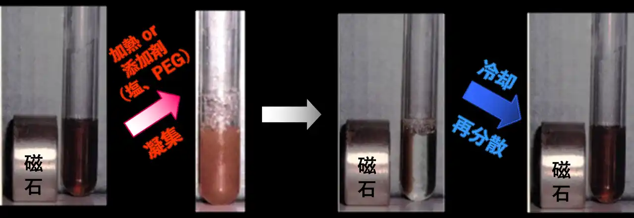 刺激応答性磁性ナノ粒子(Therma-Max、Vira-Max)は室温では水に完全に分散しているため磁石による磁気分離は困難であるが(左端図)、加熱(30℃以上)もしくは添加剤(硫酸ナトリウム、塩化ナトリウム、PEGなど)により凝集する(中央左図)。凝集体は磁石による迅速な磁気分離が可能(中央右図)であり、更に冷却操作により再分散する(右端図)。 |