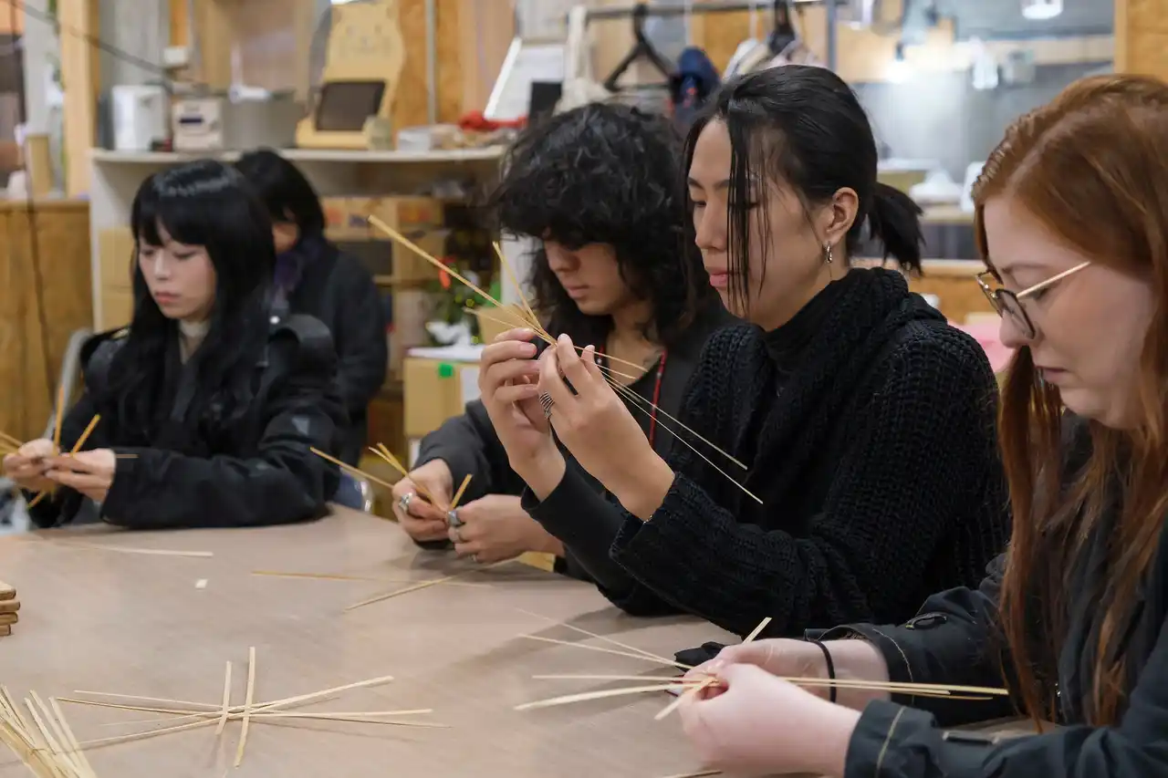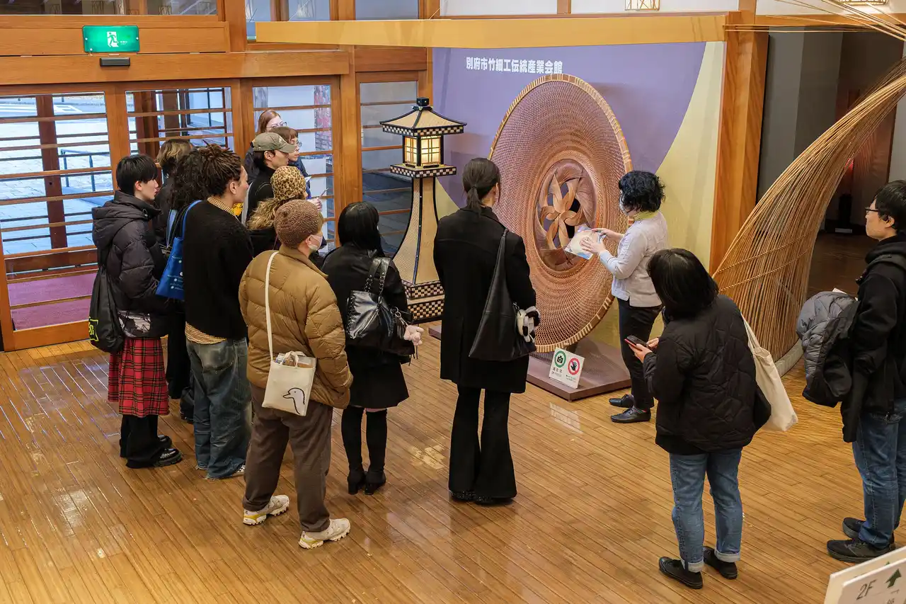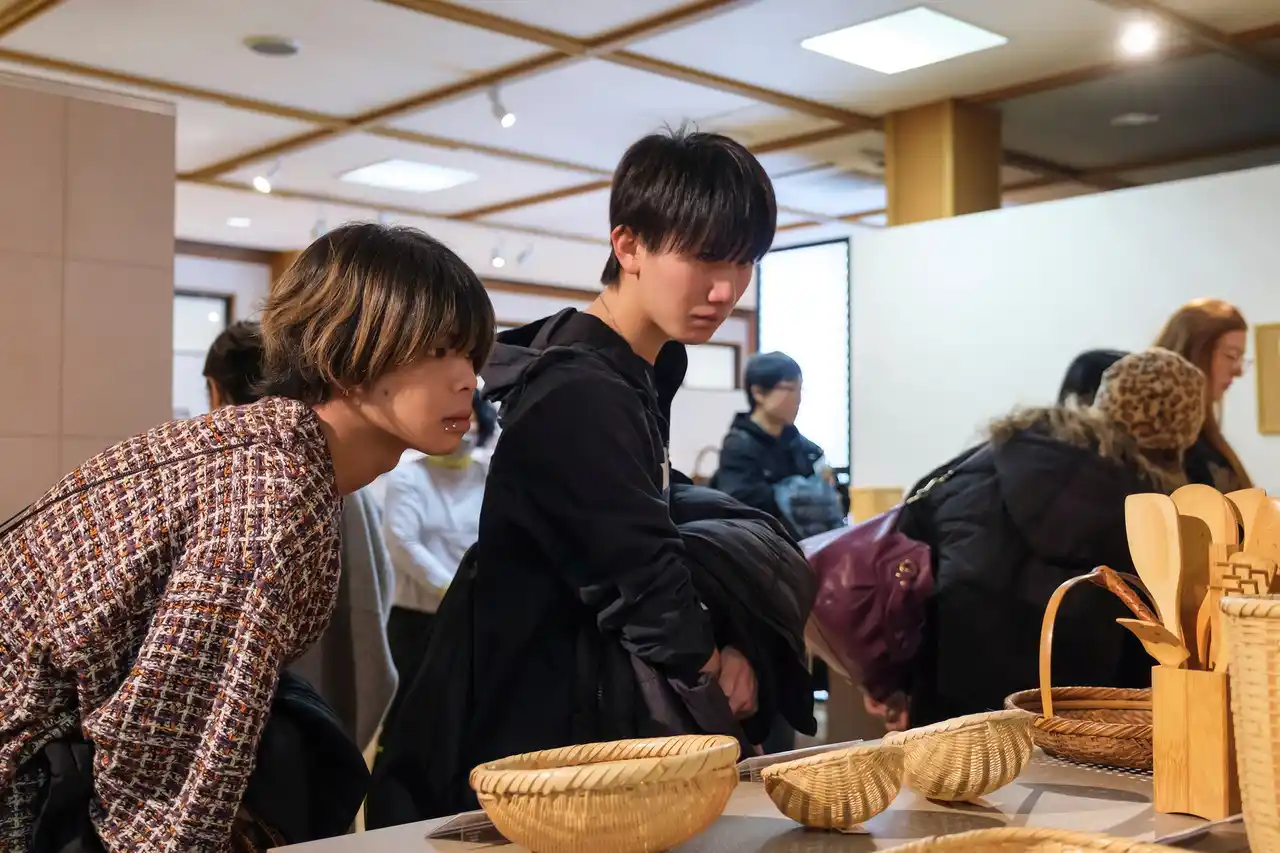 プロジェクト3日目には、別府市竹細工伝統産業会館を視察し、竹藝家のこじまちから氏より、大分県の伝統工芸である竹細工についてのレクチャー、体験を受けました。 |