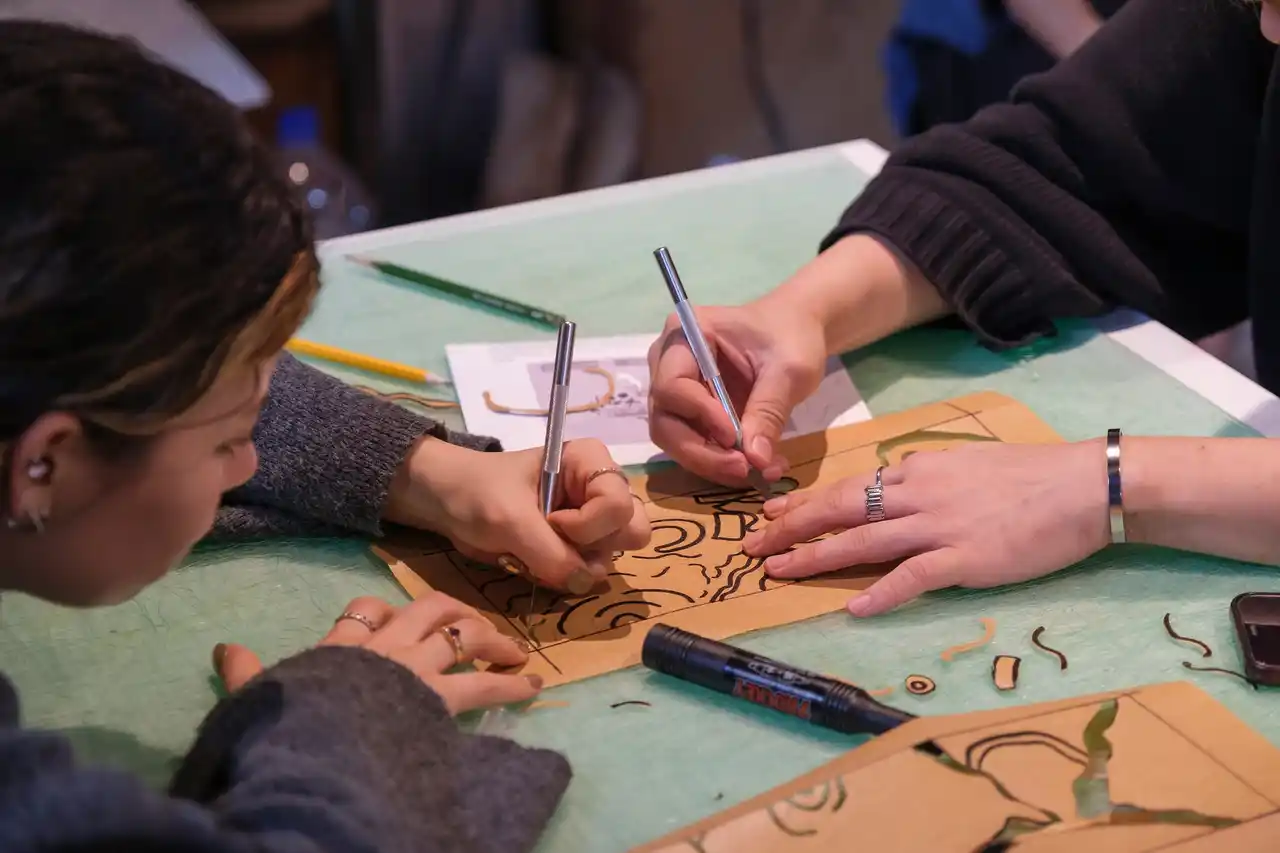 プロジェクト2日目には、温泉染研究所 行橋智彦氏より、温泉地である別府市ならではの染色技法である「温泉染」についてレクチャーを受け、実際に温泉染を体験しました。また鉛筆画家アーティストの勝正光氏のもと別府市内のアートを散策しました。 |