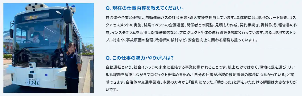 ・当社が描く未来のモビリティ社会のビジョン ・当社が参画する全国各地の自動運転社会実装事業の事例紹介 ・営業、技術、開発それぞれのフィールドで活躍する社員の声 ・モビリティ・DX事業本部長からのメッセージ |