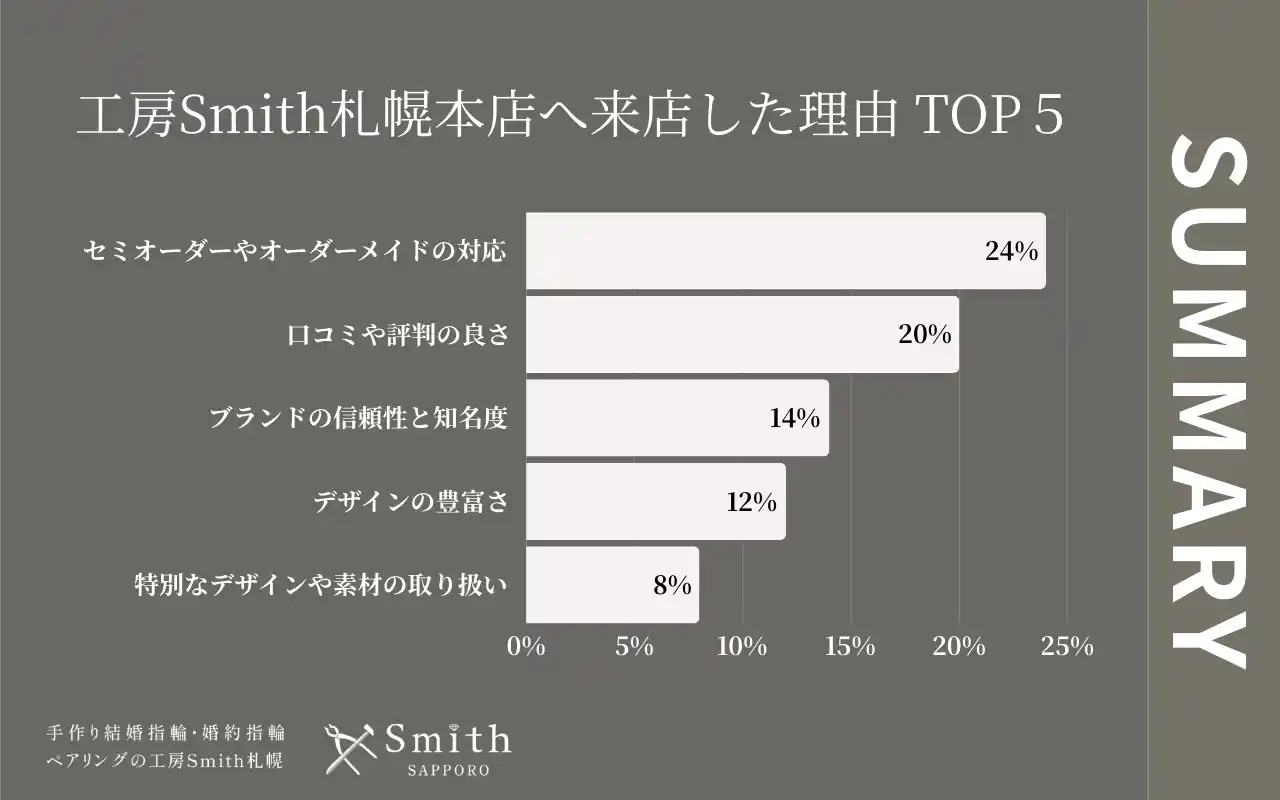 | 株式会社一宝(所在地:北海道札幌市)が運営する、北海道の手作り結婚指輪・婚約指輪専門店「工房Smith札幌本店」は、2025年(1月~12月)にご来店いただいた多くのお客様の声をまとめました。 そこで、この1年間で先輩カップルが実際に選んだご予算や、お店選びの決め手となったポイントを「人気ランキング形式」で発表いたします。2025年のブライダル市場の総括として、これから指輪選びを始めるおふたりにぜひ参考にしていただきたいトレンド情報です。 | |||