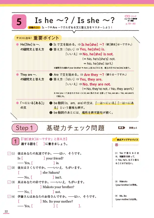 | ▲〈中1英語〉重要ポイントをおさえたら、基礎力チェック問題で確認してみましょう。 | |||||||||