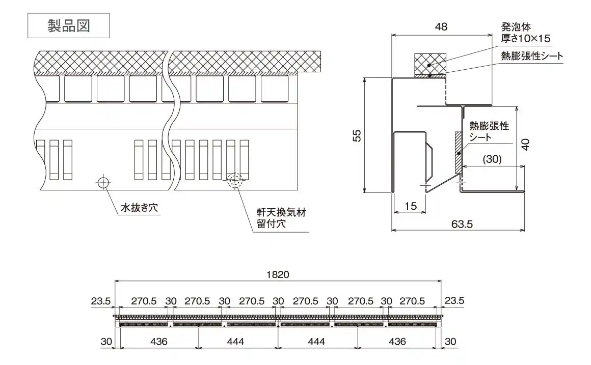 【製品情報】 防火対応 軒天換気材(軒ゼロタイプ 破風レス対応)30分準耐火構造認定品 品番:FV-DE055-L18 色型番:ブラック(BK) 長さ: 1,820mm 材質: カラーGL鋼板*(高耐食仕様、厚さ:0.35mm) *JIS G3322 発泡体:EPDM 熱膨張シート:ブチルゴム系 有効換気面積 :100c平方メートル /m 梱包: 6本/ケース 正価 :15,000円/本 付属品 :留付ビス 36本/ケース(6本/袋×6袋) |