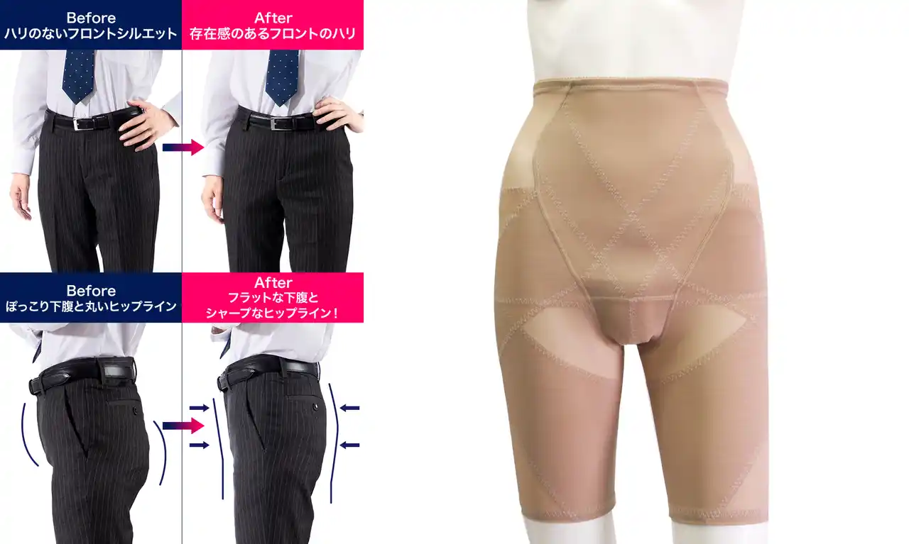ヒップ、下腹、太ももをしっかり引き締め、丸みを抑えたシルエットする強力なガードルです。 前面のポケットに付属のクッションパッドを入れるとより男らしいシルエットになります。 |