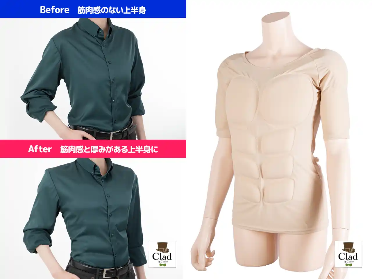 しっかり厚みのある胸筋と、シックスパック! 肩と二の腕には綿を埋め混んでおり、上半身の厚みが薄くて男装映えしないと悩んでいる人におすすめです。 |
