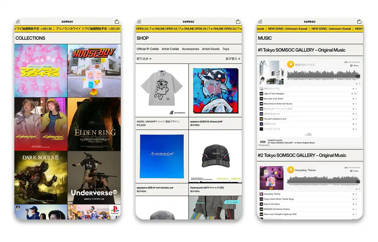 SOMSOCの構想は、2022年に原宿の小さなギャラリー空間から始まりました。 「SOMSOC」とは「COSMOS(宇宙)」の鏡像を意味し、表現者の内に潜む宇宙を表します。表現者の宇宙と現実を繋ぎ、未知の出会いを呼び起こし、知らない世界へ導くワームホールのような存在でありたい。そんな思いを胸に、展示、物販、音楽、IP コラボレーション、イベント、オンラインコンテンツと活動を広げながら駆け抜けてまいりました。そして今年、その世界観はようやく“形”として立ち上がります。表現の形式やメディアは変化しても、「アートとカルチャーを、より身近で開かれたものにする」という初心は変わっていません。 |