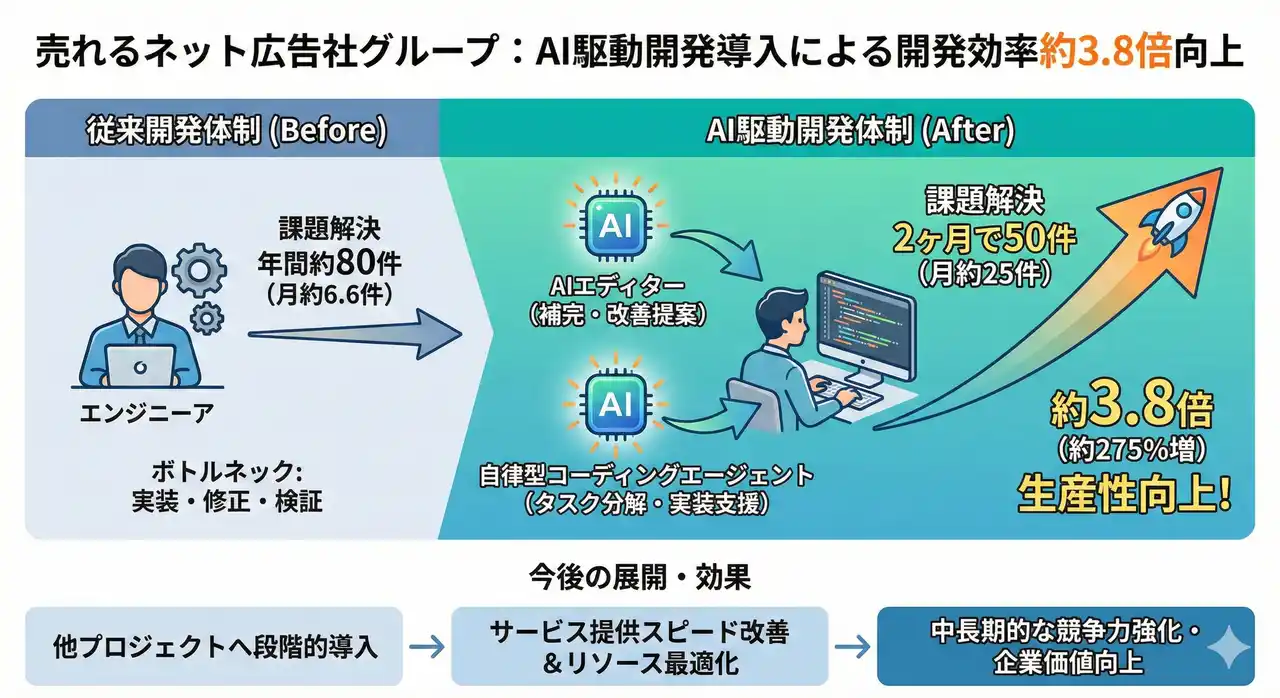 売れるネット広告社グループ株式会社(本社:福岡県福岡市、代表取締役社長 CEO:植木原宗平、東証グロース市場:証券コード9235、以下 売れるネット広告社グループ)は、連結子会社である株式会社SOBAプロジェクトにおいて、AI駆動開発を活用した開発体制の検証を実施し、開発効率の大幅な向上を確認いたしました。 |