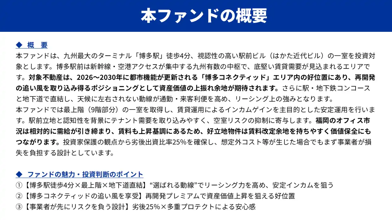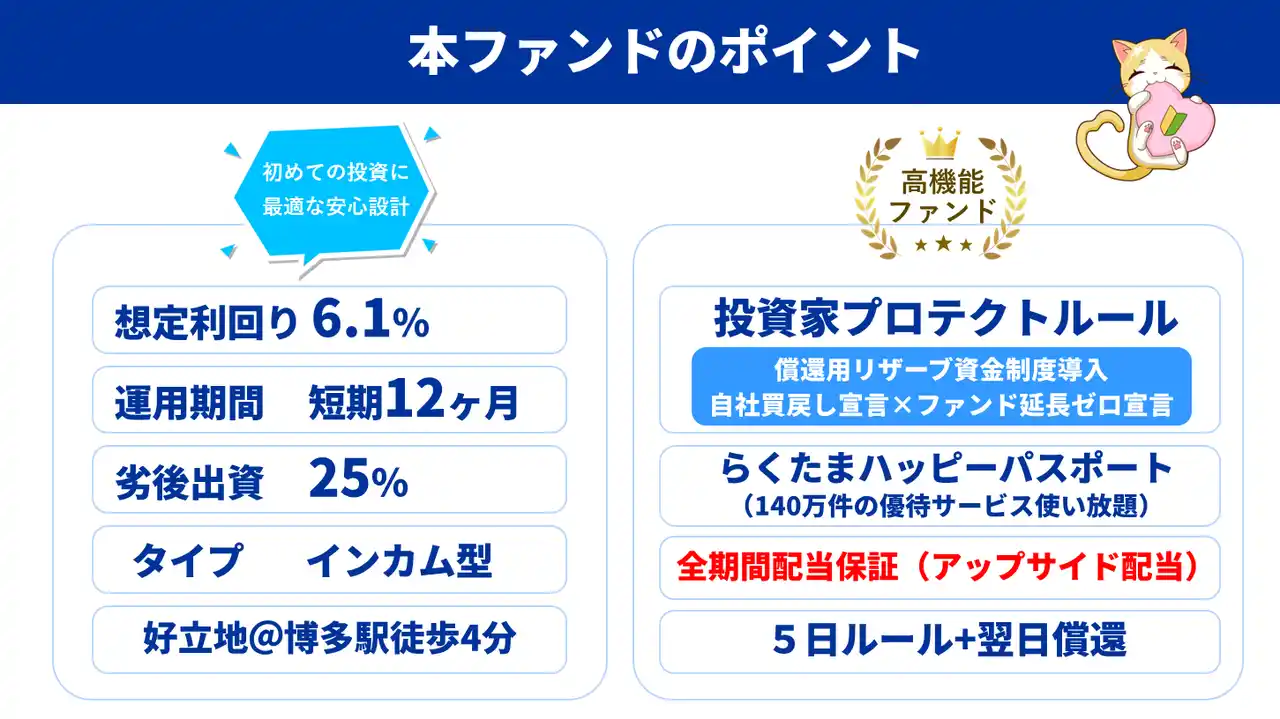 『らくたま35号(博多ステーションフロント)』本日12時より募集スタート!「全期間配当保証」「翌日償還」「優先劣後システム」を採用した高機能ファンドで資金効率最大化と投資安定性の向上を目指します