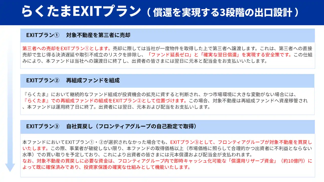 | 『らくたま』は、不動産クラウドファンディングをより安心で身近な資産形成の手段としてお届けするために誕生しました。私たちは安全性と透明性を常に重視し、堅実なファンド設計と多彩な特典プログラムを通じて、従来の「投資=堅い・難しい」という固定観念を取り払い、誰もが1万円から参加できる新しい投資体験を提供してまいります。 | ||||||||||