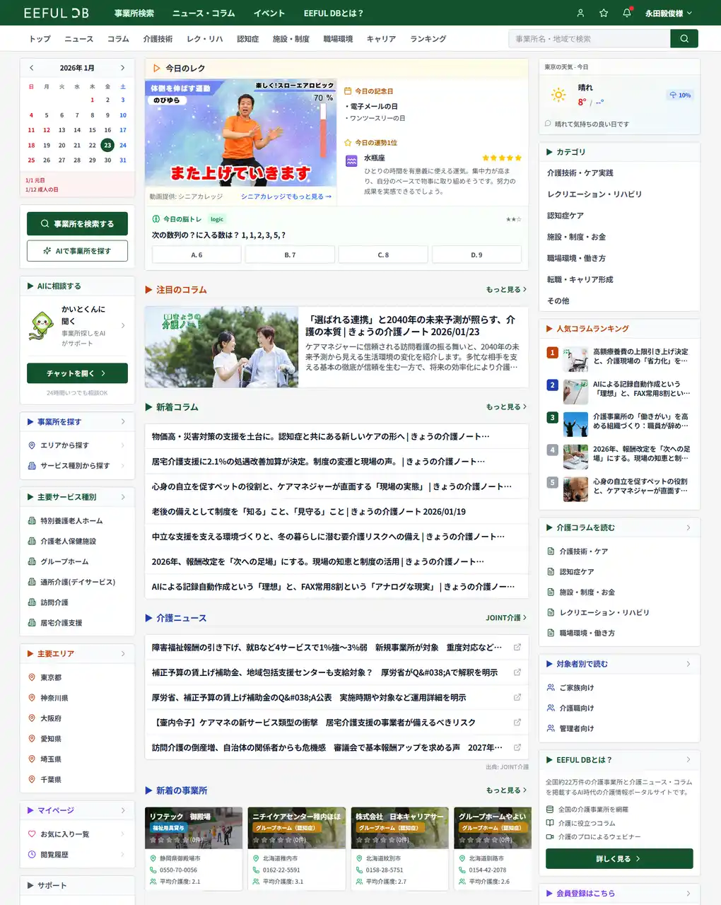 など、専門情報だけでなく、日々の業務や生活の合間に気軽に読める要素を取り入れることで、EEFUL DBを「必要なときだけ使うサイト」ではなく、日常的に立ち寄りたくなる介護情報ポータルサイトとして位置づけています。 |