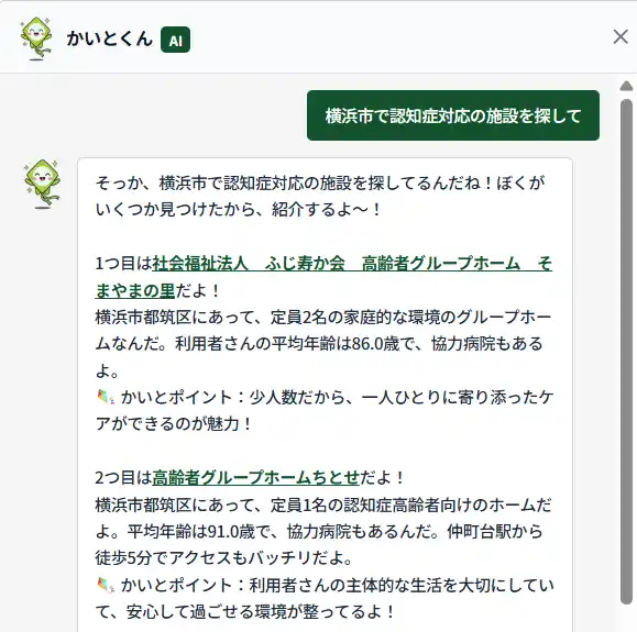AIによる介護事業所検索では、条件指定だけでなく、自然な言葉での相談を起点に情報にたどり着ける設計を採用。 専門知識や制度理解が十分でなくても、対話を通じて状況や希望を整理しながら、無理なく選択肢を絞り込むことができます。 |