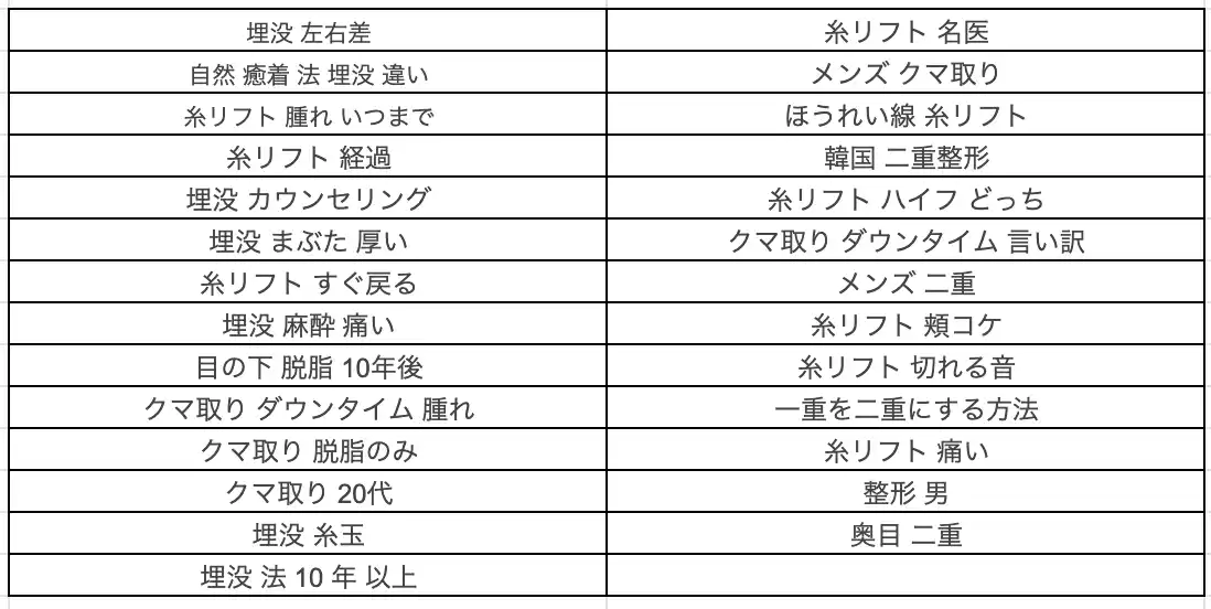 ・「◯◯(地域名) 糸リフト」で1位 ・「◯◯(地域名) 二重埋没」で1位 |