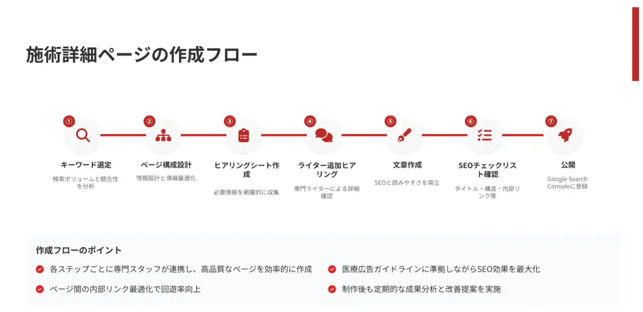 特に美容クリニックの集患に直結する施術ページの情報量 × 専門性 × SEO最適化 を強化し、来院率(CVR)と検索流入の両方を高めます。 |