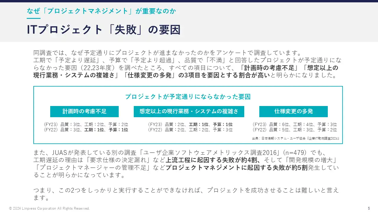 とある調査によると、工期遅延の理由は「要求仕様の決定漏れ」など上流工程に起因する失敗が約4割、そして「開発規模の増大」「プロジェクトマネージャーの管理不足」などプロジェクトマネジメントに起因する失敗が約5割発生していることが明らかになっています。 |