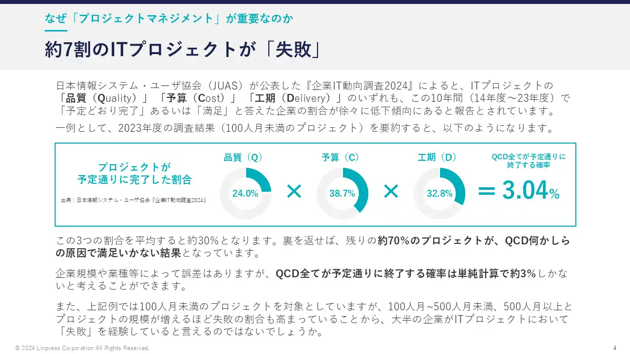 ITプロジェクトの「品質(Quality)」 「予算(Cost)」 「工期(Delivery)」のいずれも、この10年間(14年度~23年度)で「予定どおり完了」あるいは「満足」と答えた企業の割合が徐々に低下傾向にあると報告とされています。 |