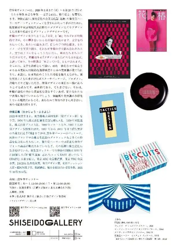資生堂ギャラリーでの仲條の個展は2012年に開催した「仲條正義展 忘れちゃってEASY思い出してCRAZY」以来2回目。東京ADC 会員最高賞、東京TDC 会員金賞、JAGDA亀倉雄策賞、毎日デザイン賞、毎日ファッション大賞・鯨岡阿美子賞、紫綬褒章、旭日小綬章ほか受賞多数。2021年10月26日没。 |