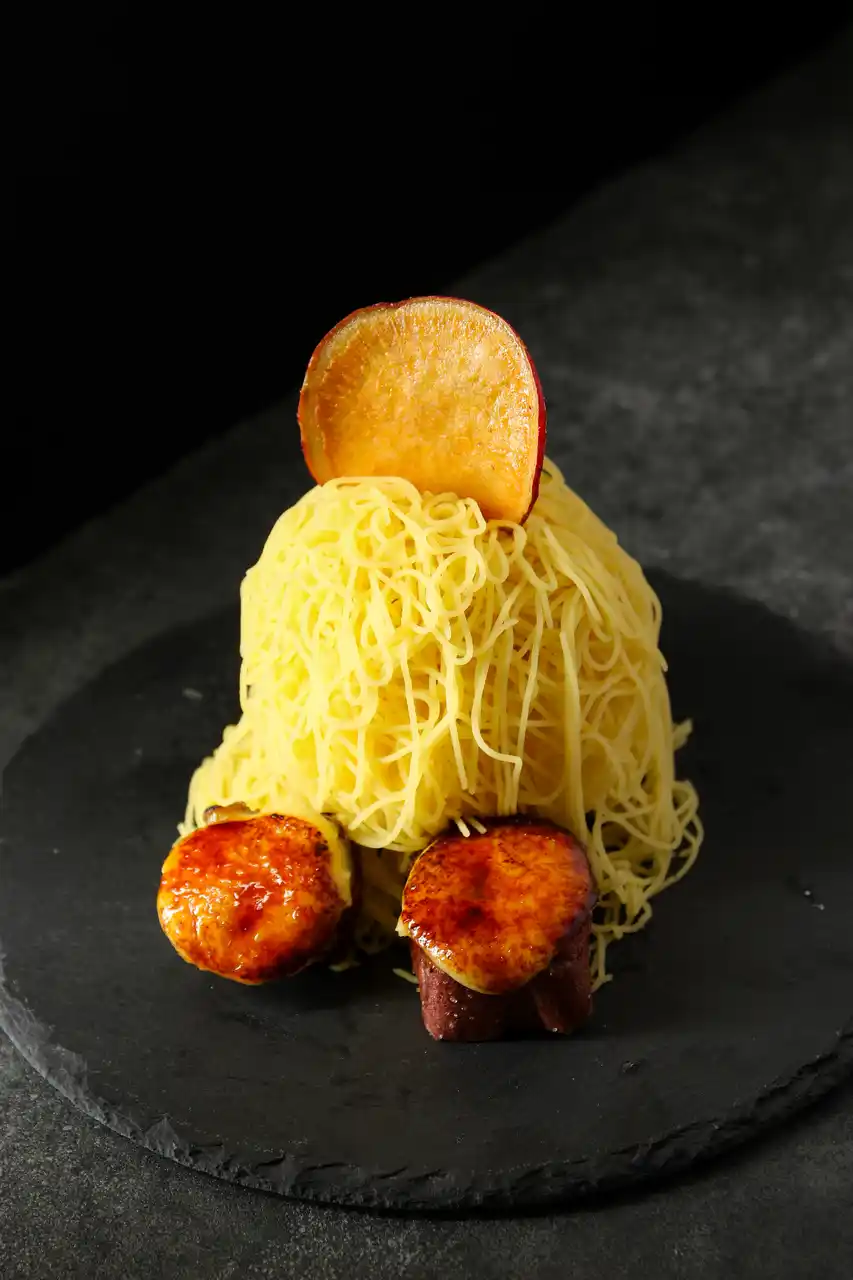 カットした金蜜芋にバニラアイスをのせ仕上げに1mmモンブランを繊細にまとわせました。 |