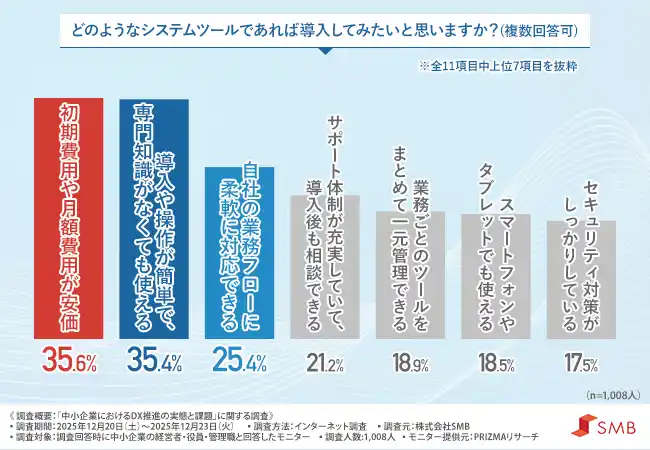 全員に、「どのようなシステムツールであれば導入してみたいと思うか」について尋ねたところ、『初期費用や月額費用が安価(35.6%)』と回答した方が最も多く、『導入や操作が簡単で、専門知識がなくても使える(35.4%)』『自社の業務フローに柔軟に対応できる(25.4%)』と続きました。 |