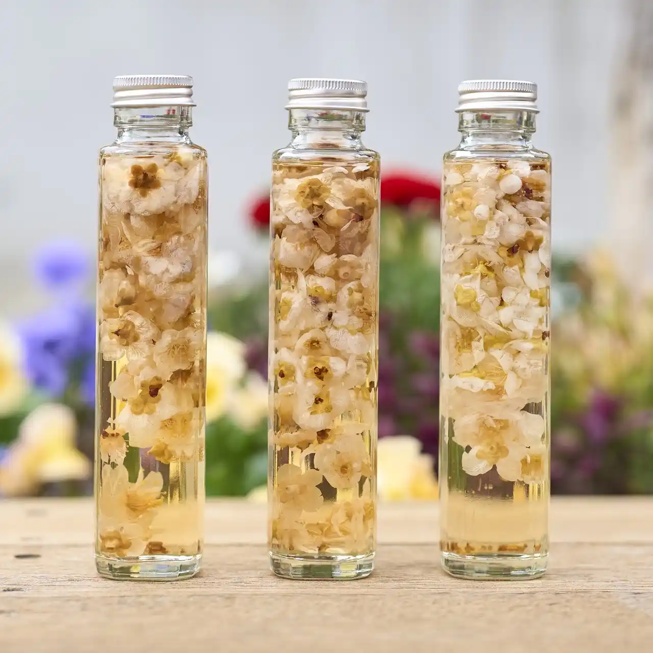梅の花の収穫から体験できる「梅のチンキづくり」を開催いたします。チンキとは、植物をアルコールに漬け込み、香りや成分をゆっくりと抽出する昔ながらの保存方法です。梅園をお散歩し、梅の花を摘み採り、梅の甘く優しい香りを瓶の中に閉じ込めます。完成した梅のチンキは、お風呂に入れたり、アロマやルームスプレーなどとしてお使いいただけます。 |