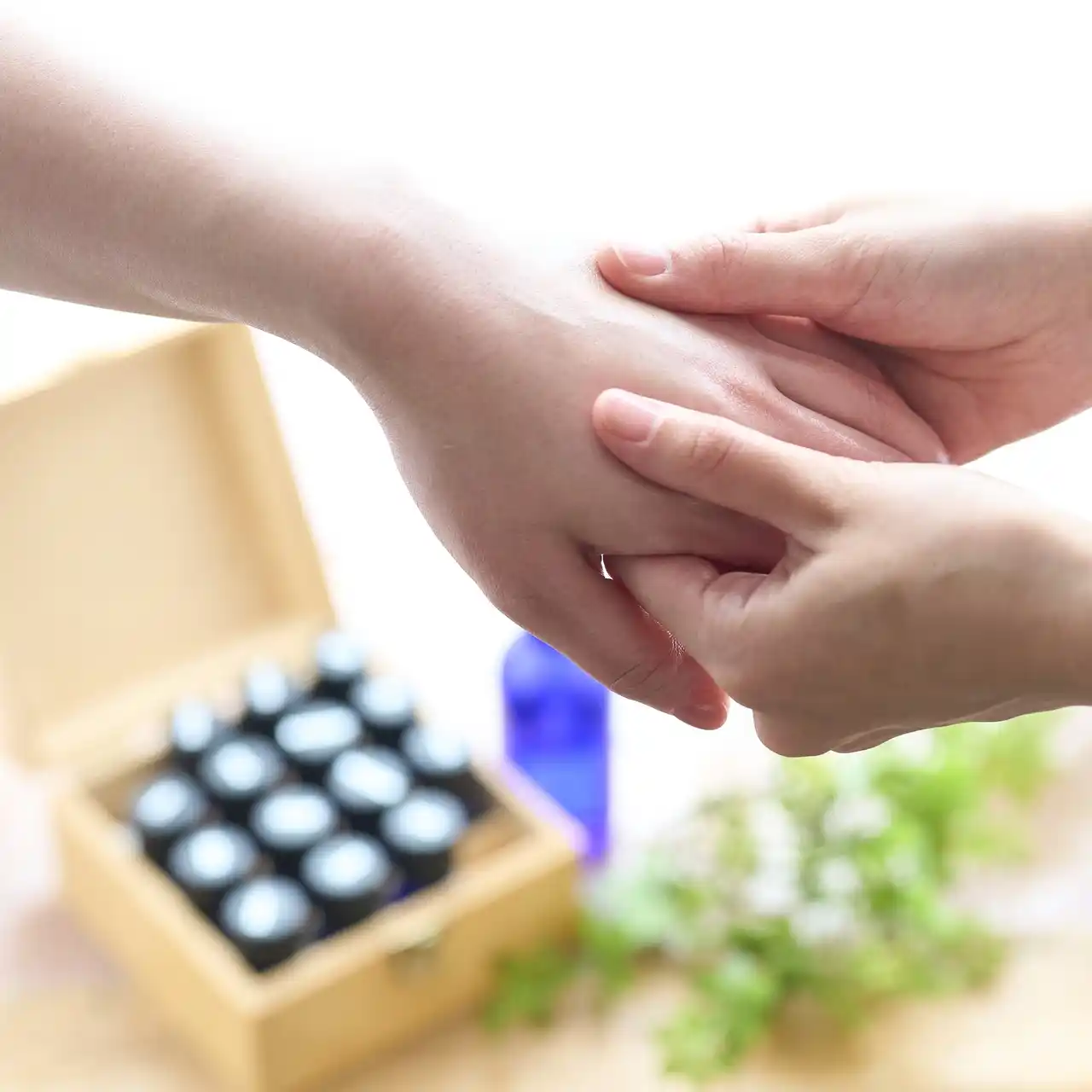リソルの森の天空サロン『スパ ジュール・フェリエ』のセラピストのアロマオイルを使ったハンドスパを体験できます。手元の乾燥が気になる方におすすめです。お好みの香りで癒しのひとときを お過ごしください。 |