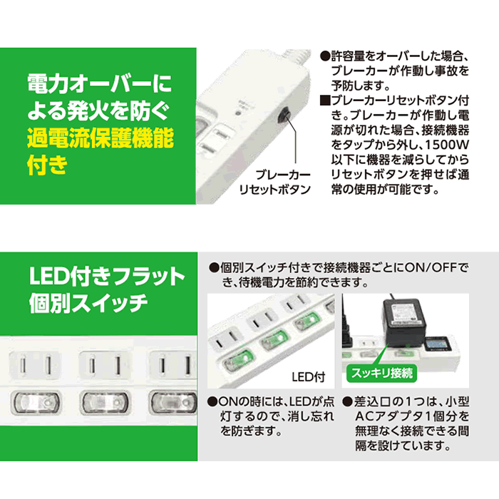 | ◆節電タップ(独立スイッチ付) 2個口+USBポート×2 | ||||||||||||||