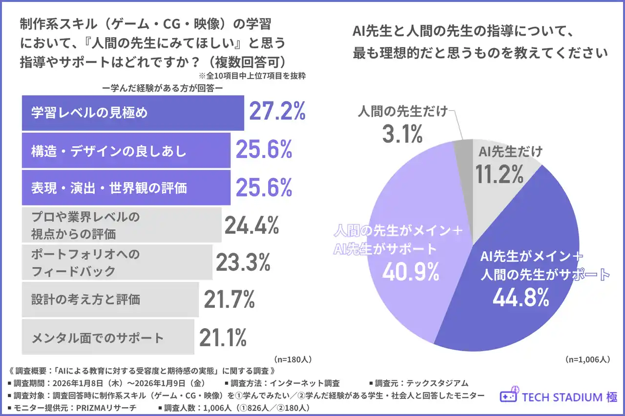 今回の調査で、制作系スキル(ゲーム・CG・映像)の学習におけるAI活用の可能性と、学習者が求める「新しい学びの形」が明らかになりました。 |
