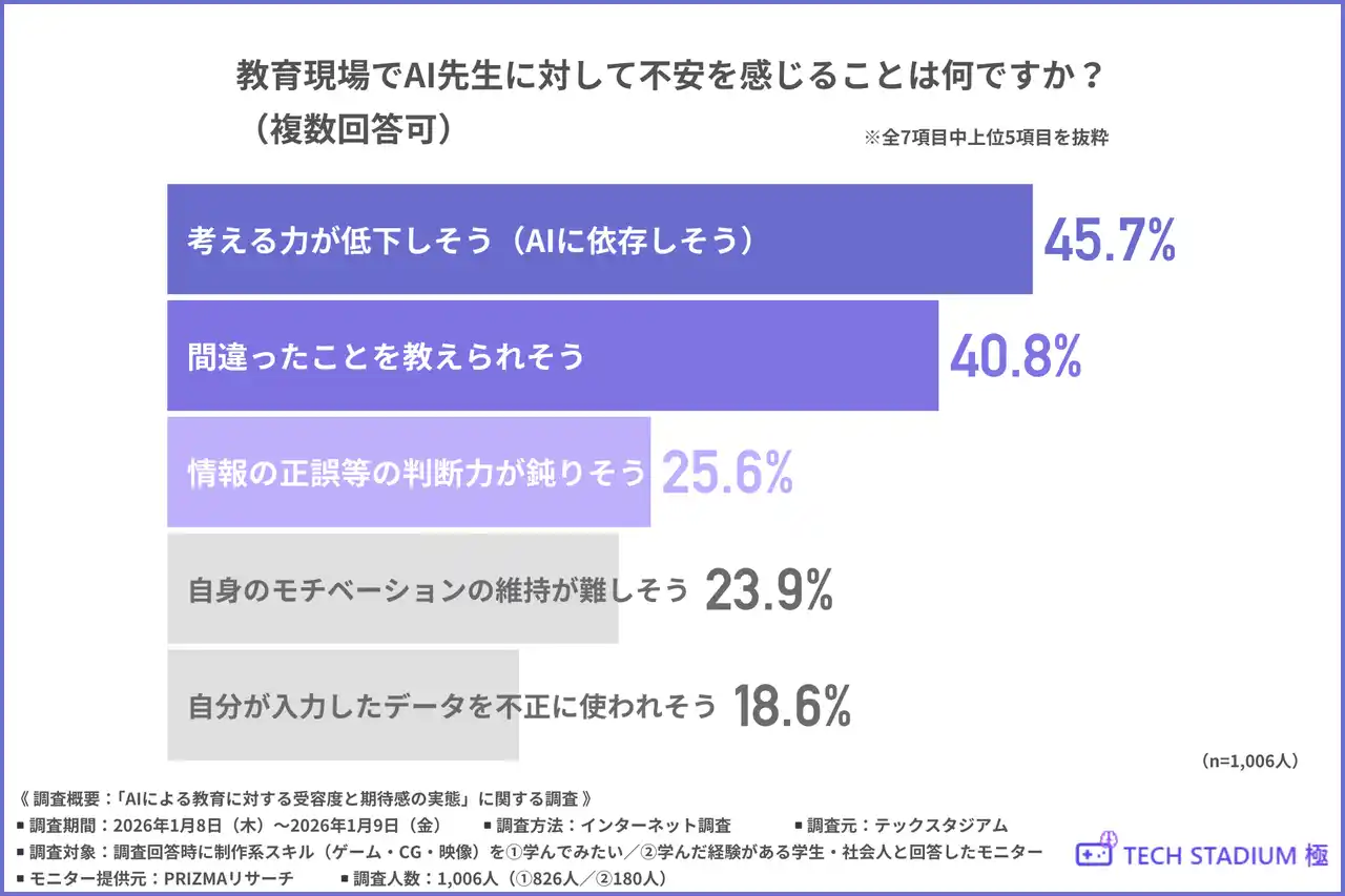 「教育現場でAI先生に対して不安を感じること」について尋ねたところ、『考える力が低下しそう(AIに依存しそう)(45.7%)』と回答した方が最も多く、『間違ったことを教えられそう(40.8%)』『情報の正誤等の判断力が鈍りそう(25.6%)』となりました。 |