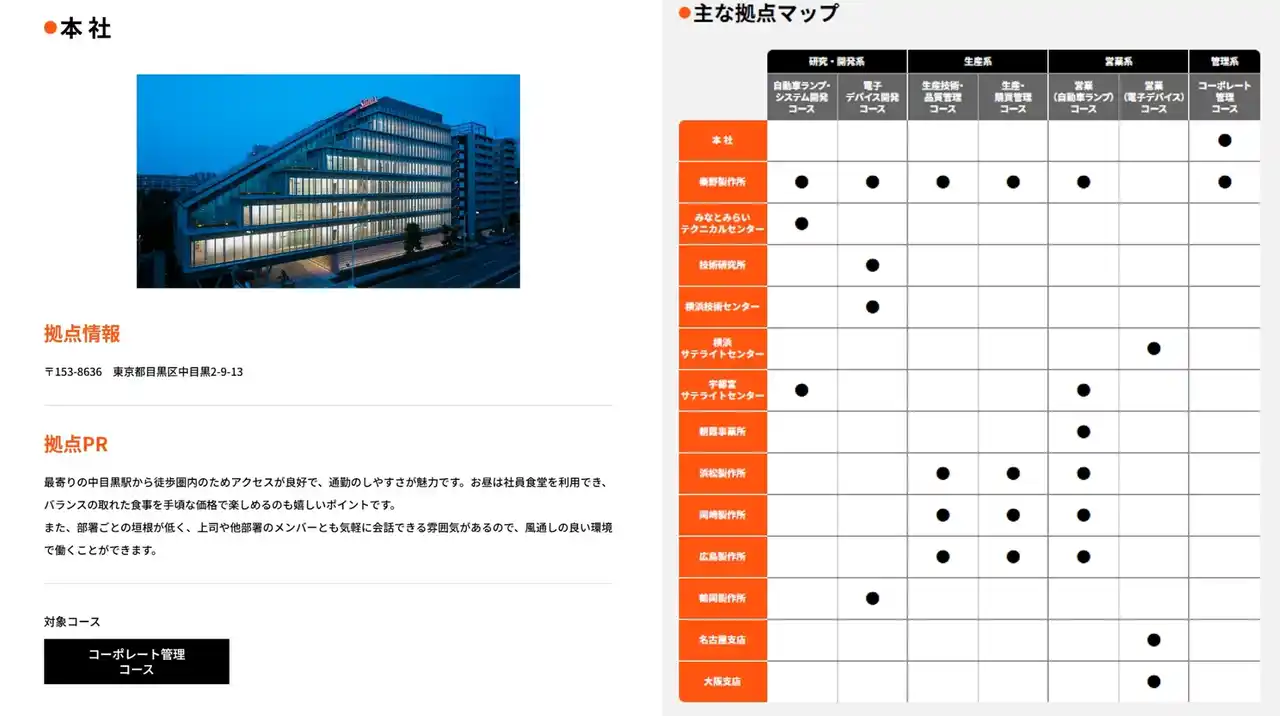 各拠点の情報を充実させるとともに、「コース×拠点マップ」を新設しました。各コースの主な活躍拠点を一目で確認でき、働く場所を具体的にイメージしやすい内容となっています。 |