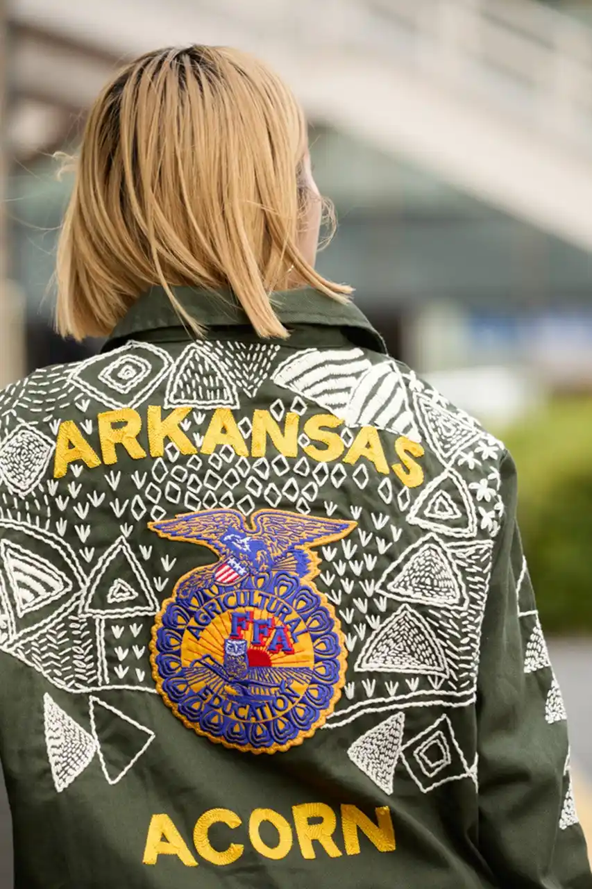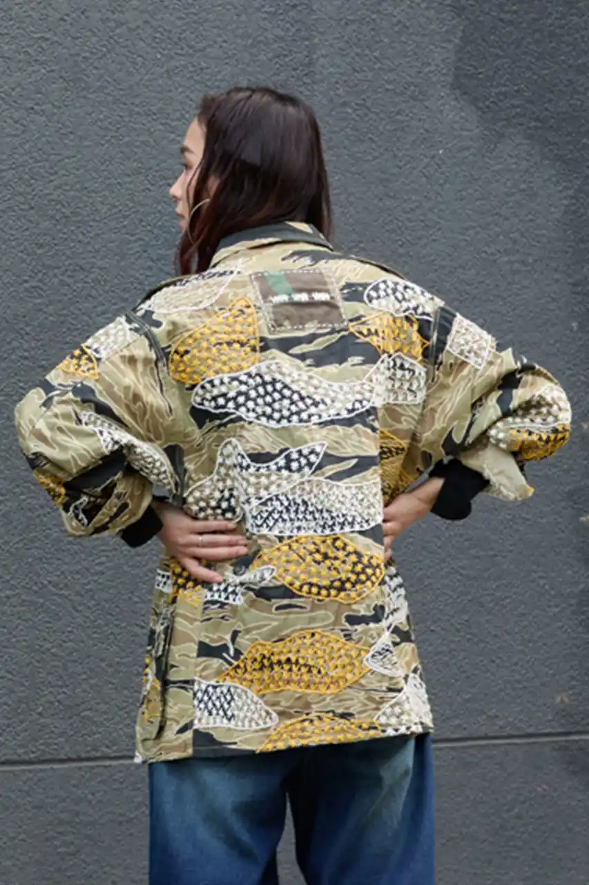 無地のミリタリーシャツに、ベトナムジャンパー(通称ベトジャン)の背景に着想を得た刺繍を施しました。 ベトジャンは、ベトナム戦争時に現地へ駐留していたアメリカ兵たちが、ベトナムの仕立て屋にオーダーし、帰国時のお土産として持ち帰った刺繍入りジャケットのこと。 虎や龍、ベトナム地図、メッセージなどを大胆に刺繍したそれらは、当時の記憶や土地の空気をまとった、スーベニアジャケットの象徴的存在です。 本作では、そのなかでも象徴的なベトナム地図をモチーフに、カラフルな刺繍で表現。