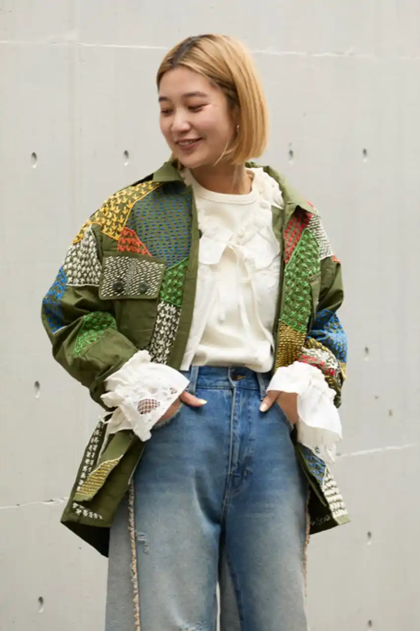 襟付きのショート丈ブルゾンに、象形文字や小花、十字架、イラストのようなモチーフまで、さまざまな刺繍を散りばめました。 多様なモチーフが共存する表情は、ハンドステッチならではの温度感を感じさせます。フロントジップが途中までしか付いていない仕様も、古着ならではの愛嬌あるディテール。 もともと施されていた刺繍やワッペンと、新たに加えたハンドステッチが交差する表情も見どころです。 ややコンパクトなサイズ感は今の気分にフィットし、ワイドパンツやワンピースとのスタイリングとも好相性。 トレンド感のある着こなしを楽しみたい方、特におしゃれ感度の高い男性にもおすすめの一着です。 |