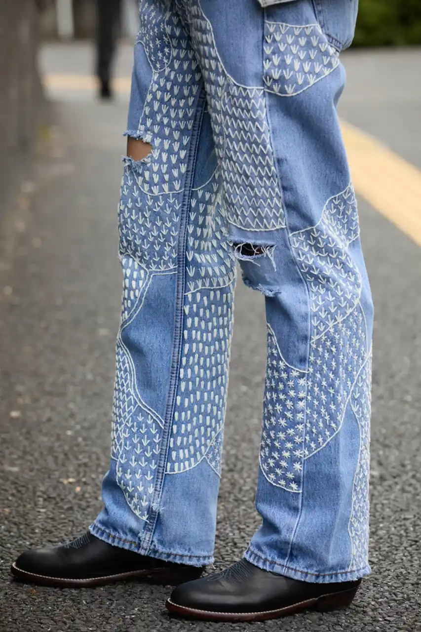 同シリーズで展開するデニムパンツ。50年代のワークデニムを思わせるディテールをベースに、現代的なバランスに落とし込んだ一本です。フロントはクラシックなボタンフライ仕様。春らしい淡いインディゴに刺繍糸が映え、加工で施したボロ感が奥行きを演出。 ヒップ周りまで贅沢に施した刺繍は圧巻の存在感です。無地のTシャツを合わせるだけで、スタイルが完成します。 |