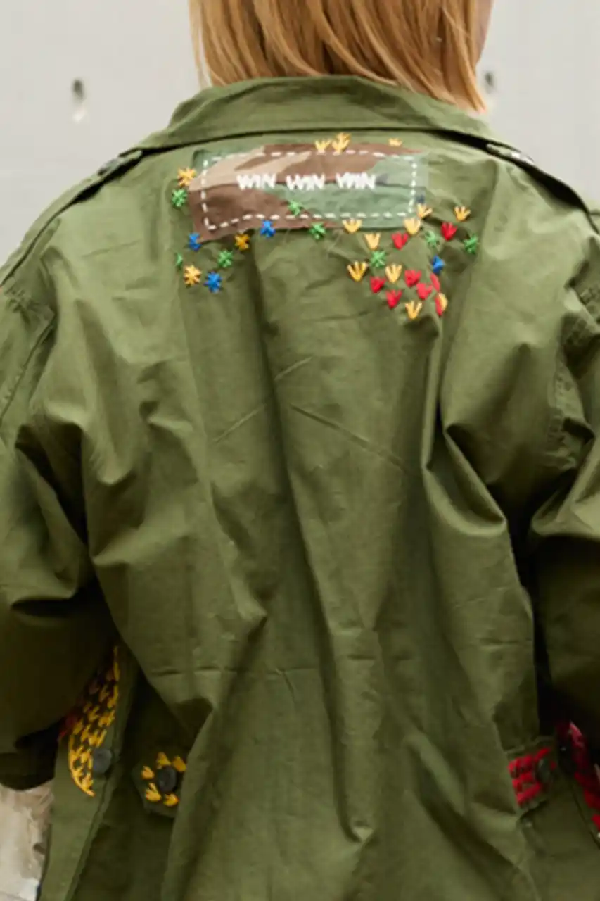 ミリタリーシャツの柄をベースに、ハンドステッチで刺繍を描き足した一着。 デニムシリーズとは異なり、身生地に自然となじむ生成りの刺繍糸を使用しています。 アクセントとしてイエローを差し色に取り入れ、前立てには三角文様を配置。主張しすぎないなかに、さりげない個性が光る仕上がりです。 全体はゆとりのあるサイズ感で、甘さを抑えたデザイン。 ジェンダーを問わず、男性にも自然に取り入れていただけます。 |