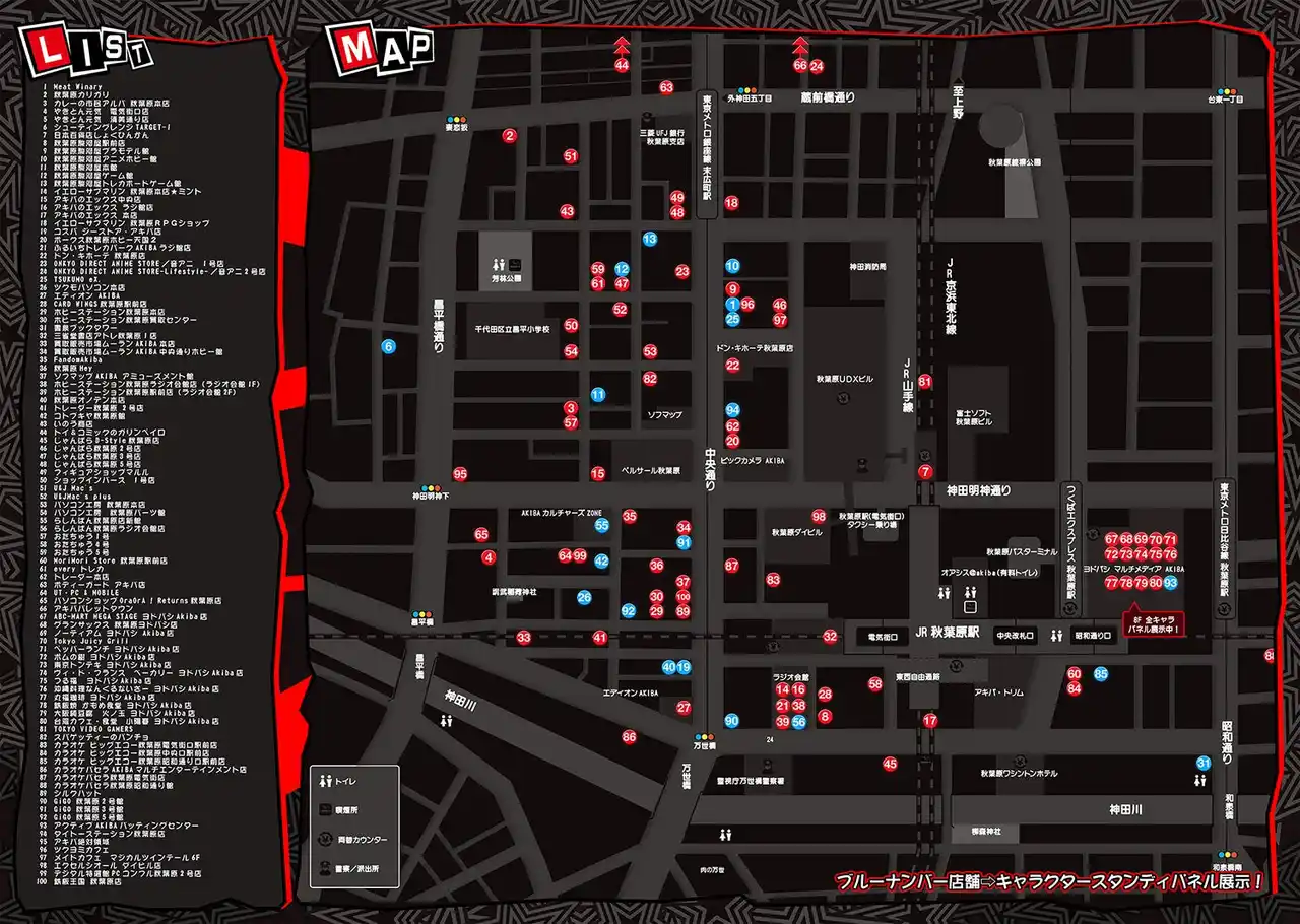秋葉原駅前から中央通りにある100の対象店舗にてお買い物をされた方に、1会計につき1枚、本キャンペーン限定のオリジナルステッカー(全6種、ランダム配布)をプレゼント! 一部店舗には、本企画に合わせた特別なセリフが楽しめる『P5X』キャラクターたちのスタンドパネルも設置されます。 |