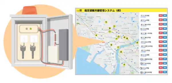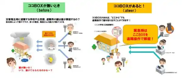 ては行政担当者(施設の鍵の管理者)が現地へ直行できない場合もあります。遠隔操作に対応した「ココBOX」を導入することで、担当者がその場にいなくても確実かつ迅速に避難所を解錠でき、安心して避難できる環境をいち早く整えることが可能となります。