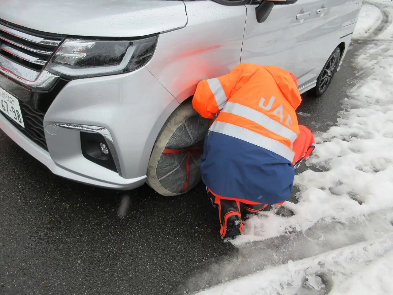 布製タイヤチェーン取り付けの様子 |