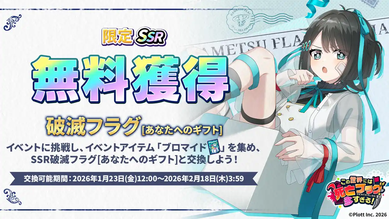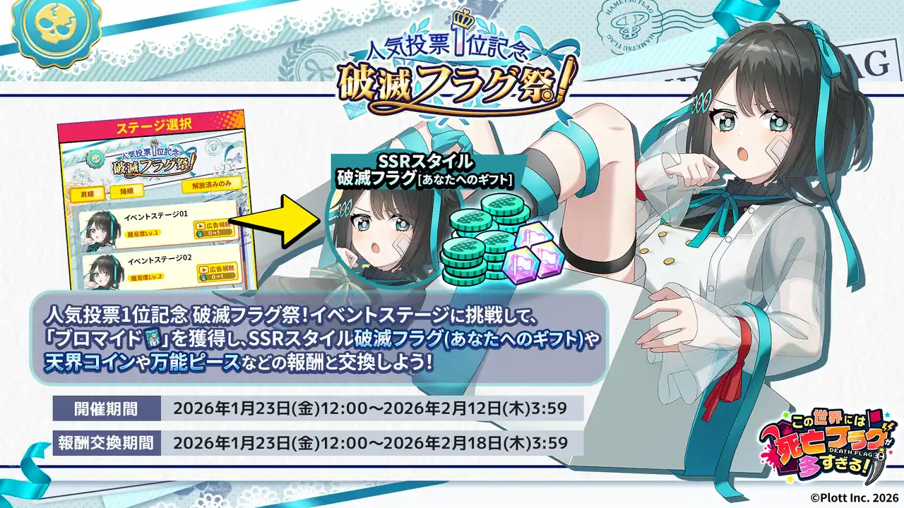 IPコンテンツの企画・制作・ビジネス展開を行う株式会社Plott(本社:東京都千代田区、代表取締役:奥野翔太、以下「Plott」)は、Plott Gamesが運営する『この世界には死亡フラグが多すぎる!』(以下、『このフラ!』)にて、人気投票企画と連動した「人気投票1位記念 破滅フラグ祭」を開催することをお知らせいたします。