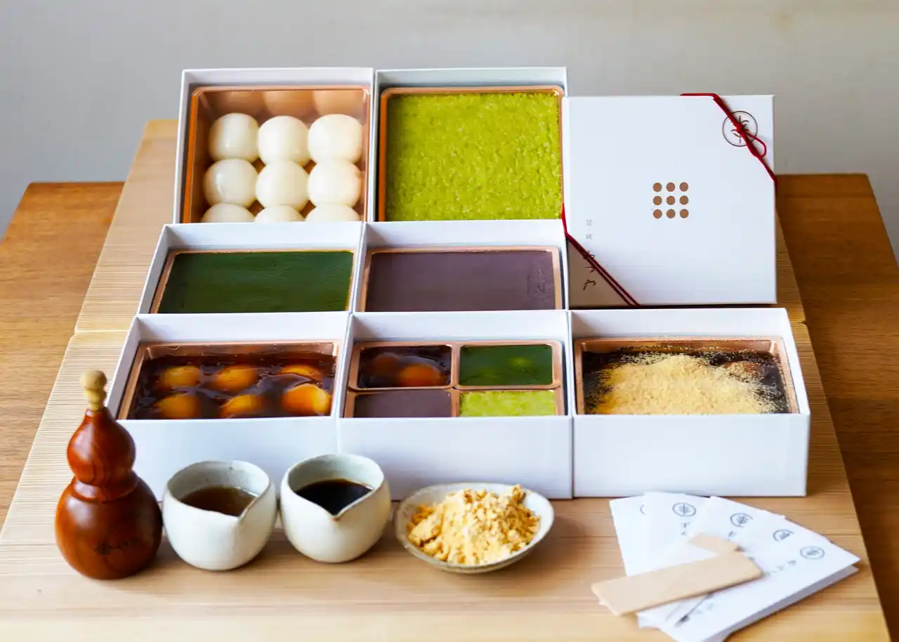 | もっちもちの白玉の上に素材にこだわった4種類の味が楽しめ、味ごとに専用のみつや調味料が付きます。 | |||